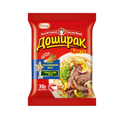 - Лапша быстрого приготовления Доширак Квисти со вкусом говядины изготавливается из натуральных ингредиентов. В ее состав входит пшеничная мука высшего сорта, яичные желтки, настоящие сушеные овощи и специи. Для приготовления лапши достаточно смешать лапшу с приправами, маслом и специями и залить ее кипятком. Дайте настояться в течение 3 минут и можете наслаждаться ароматным и горячим блюдом. По вкусу можно дополнить лапшу с соусами, майонезом или травами.