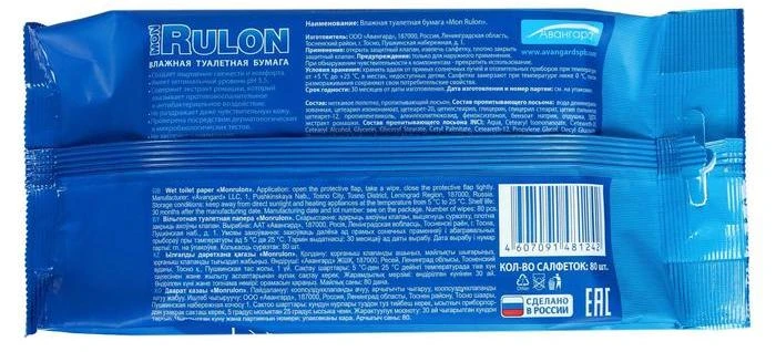- Влажная туалетная бумага Mon Rulon создает ощущение свежести и комфорта. Имеет оптимальный уровень pH 5.5. Содержит экстракт ромашки, который оказывает противовоспалительное и антибактериальное воздействие. Не раздражает даже чувствительную кожу. Проверена посредством дерматологических и микробиологических тестов. Не засоряет канализацию (не выбрасывать в унитаз более двух салфеток одновременно).