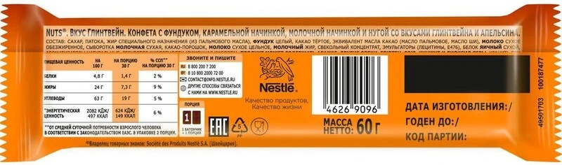 Сахар, патока, жир специального назначения (из пальмового масла), фундук целый, какао тертое, молоко сухое обезжиренное, масло какао, сыворотка молочная сухая, какао-порошок, молоко сухое цельное, молочный жир, эквивалент масла какао (масло пальмовое, масло ши), свекольный концентрат, эмульгаторы (лецитины, E376), белок яичный сухой, ароматизаторы натуральные, регулятор кислотности (лимонная кислота).