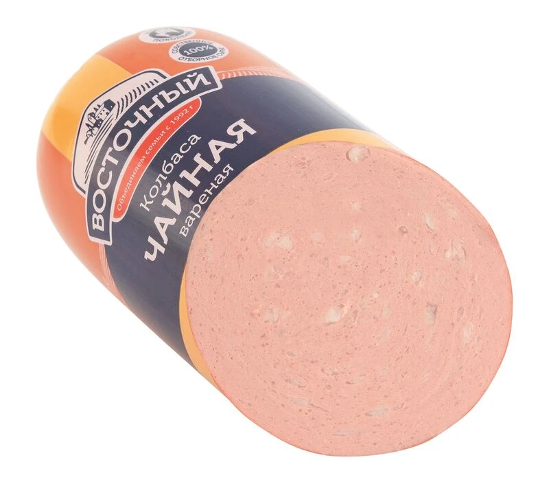 мясо цыпленка-бройлера, вода питьевая, шпик, свинина, мясо птицы механической обвалки, свиная шкурка, ячневая мука, соль, молоко сухое, белок животный (свиной), мальтодекстрин, молочный белок, ароматизаторы, декстроза, загустители (Е407, Е412, Е415), стабилизаторы (Е450, Е452i), пряности молотые (чеснок, лук, перец белый, перец черный), усилитель вкуса и аромата Е621, антиокислители (Е300, Е301, Е223), смесь посолочно-нитритная (соль, фиксатор окраски Е250), говядина, сахар белый, соевый белок, краситель Е120, регуляторы кислотности (Е338, Е262, Е331). Продукт может содержать следы го